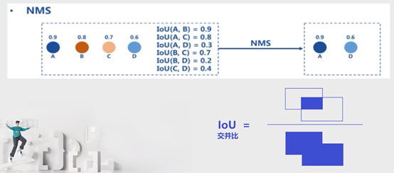 NMS:有四个候选框,IoU交并比较高,即相对重叠度较高,就要通过NMS将多余的候选框筛掉。如图,我们一般会设置一个预值为0.5,当IoU小于0.5,候选框被保留,当IoU大于0.5,将会经过NMS处理,只保留数值大的,所以最后得到A和D。