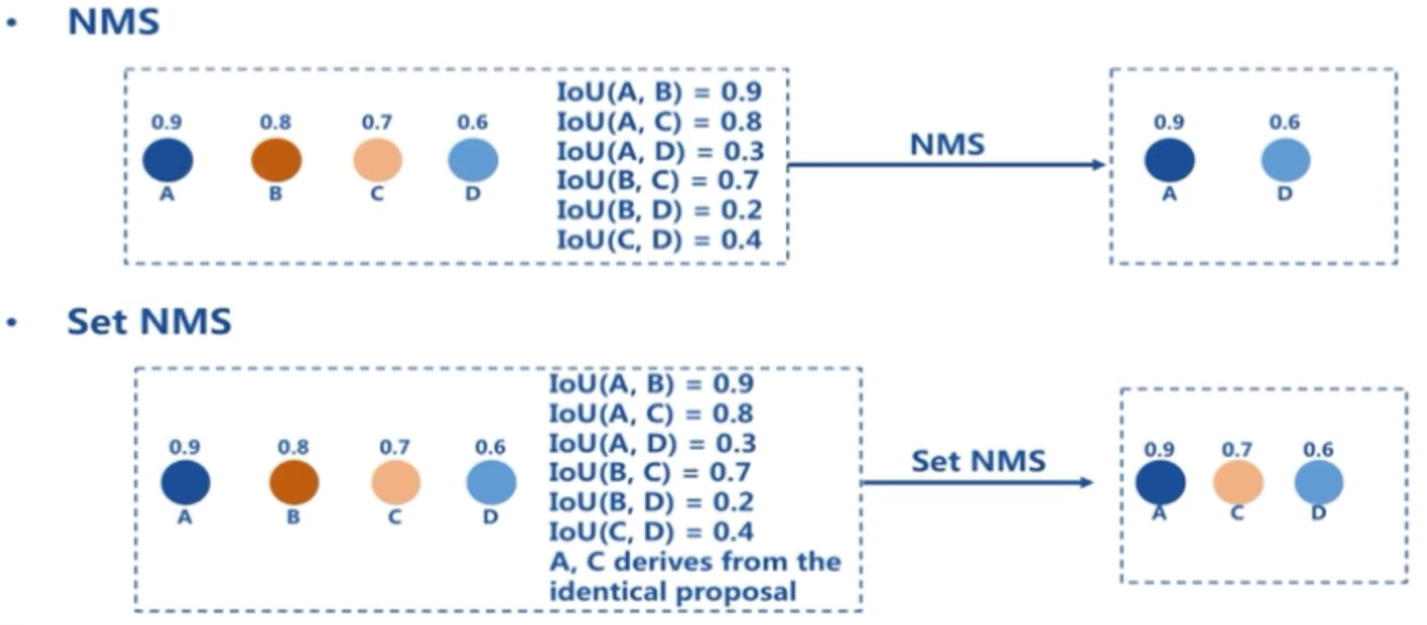 Set NMS又是如何处理的呢?依然是四个候选框,其他值不变,得知A和C来源于同一个proposal,那就不做NMS,最后得到A、C、D。