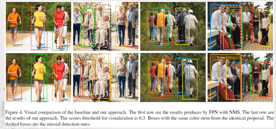 从可视化结果来看,这个效果也是很明显的,第一行图片很多重叠的虚线都是漏检的,而下方运用CrowdDetection的都能被检出。