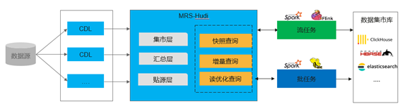 在很多实时场景中,对时延要求可以是分钟级的,这样可以通过MRS-Hudi和实时计算引擎Flink和Spark-Streaming进行增量计算实现数据的快速处理,端到端实现分钟级延迟。另外MRS-Hudi本身就是湖存储,可以存储海量数据,因此也可以支持批量计算,常用的批处理引擎可以采用Hive和Spark。