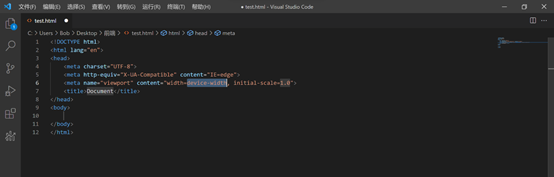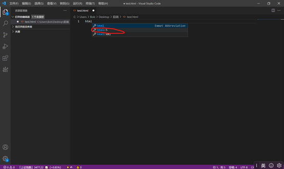 - 打开VScode,新建一个HTML文件,输入html选择html:5快速弄出代码块: