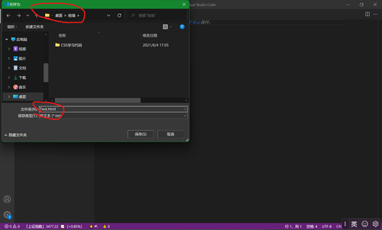 - 这里教大家一个简单的方法,如上图。首先打开VScode,按快捷键Ctrl+N新建一个文件,再按Ctrl+S快速保存到指定的文档并且将文件名和格式改好。