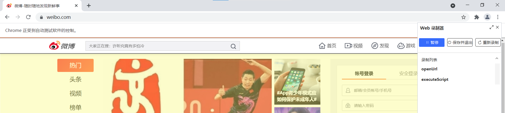 举例来说,在微博网页的登陆流程上,录制后执行的效果就非常完美。