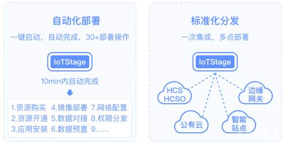 - loT Stage提供—站式购买体验。只需要—键就能完成物联网解决方案包含的应用、云资源的询价、购买及开通。