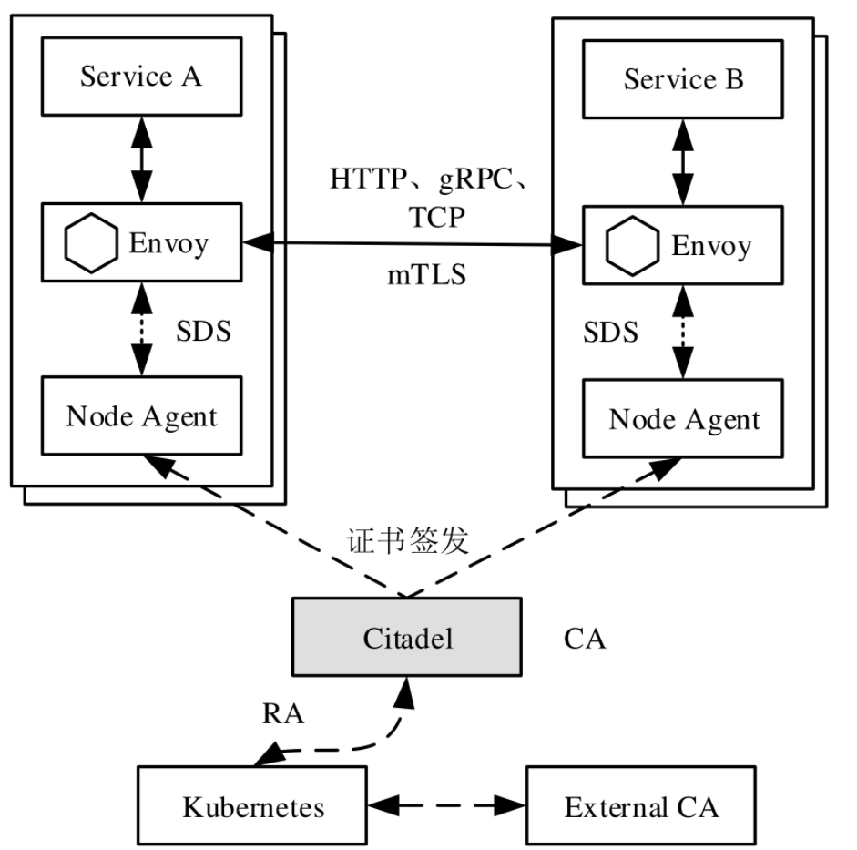 Citadel是服务网格的安全组件与NodeAgent一起为工作复杂提供证书的签发、轮换。