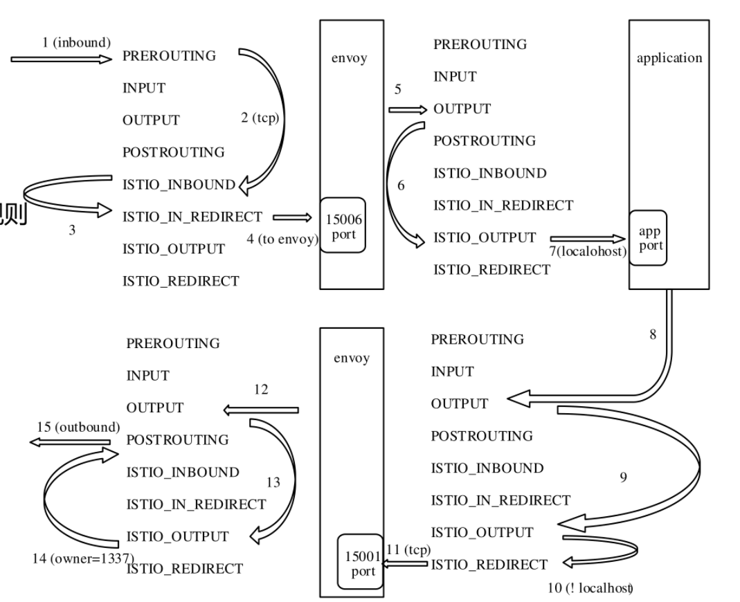 2. 流量拦截:在 Pod 初始化时设置 iptables 规则,基于配置的iptables规则拦截业务容器的Inbound流量和Outbound流量到Sidecar上。而应用程序感知不到Sidecar的存在,还以原本的方式 进行互相访问。上图中,流出frontend服务的流量会被 frontend服务侧的 Envoy拦截,而当流量到达forecast容器时,Inbound流量被forecast 服务侧的Envoy拦截。