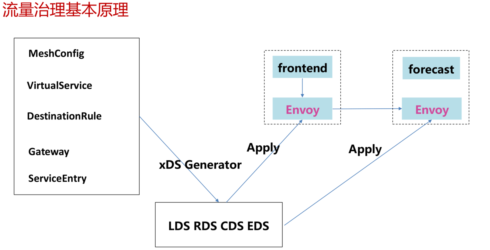 5. 流量治理:Envoy 从 Pilot 中获取配置的流量规则,在拦截到 Inbound 流量和Outbound 流量时执行治理逻辑。上图中, frontend 服务侧的 Envoy 从 Pilot 中获取流量治理规则,并根据该流量治理规则将不同特征的流量分发到forecast服务的v1或v2版本。