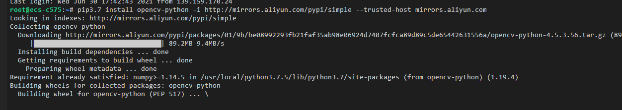pip3.7 install opencv-python -i http://mirrors.aliyun.com/pypi/simple --trusted-host mirrors.aliyun.com