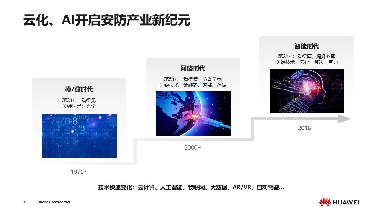 安防和大家的生活密切相关,生活的小区,工作的办公楼里都有摄像头相关的系统,这些就是最基本的安防。从产业来看,安防大概经历了半个世纪,产业发展了很长时间,从最开始的模拟信号,那时解决了“看得见”即“有/无”的问题,实现了中国神话西游记中的“千里眼,顺风耳”。在这之后,从整个技术趋势和业务发展方面来看依然不能满足客户诉求,举个例子,有一个公司的多个子公司分布在不同区域,老板希望通过远程查看不同区域的子公司,这就来到了网络时代。网络时代和现在的移动互联网结合,大大提升了安防体验,但这也带来了一个大的问题——带宽,要把视频传输到云上就要解决带宽的问题,这是关键的技术。