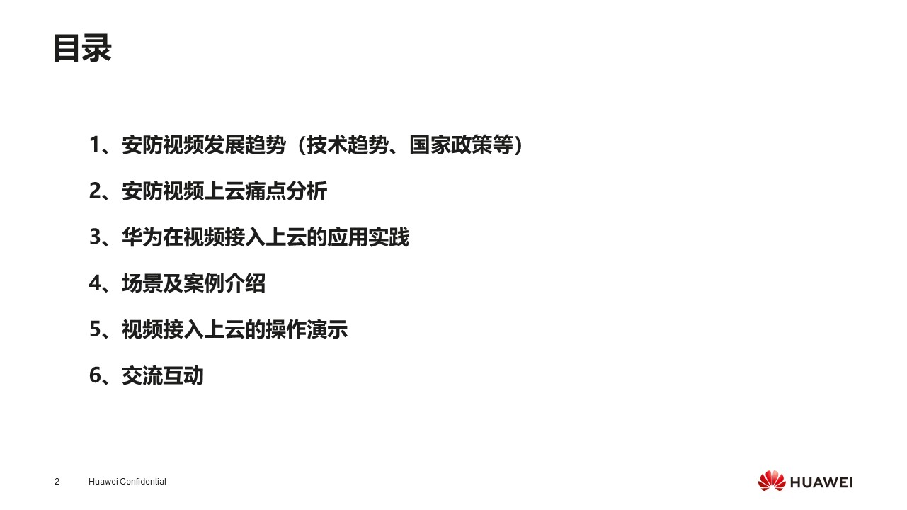 第一部分是安防视频发展趋势,包括技术趋势、国家政策等;第二部分是我们在实践过程中发现的痛点;第三部分是分享上云的应用实践;第四部分是聚焦场景和一些实践过程中的案例;第五部分有一个小视频演示上云的操作流程;第六部分是交流互动。