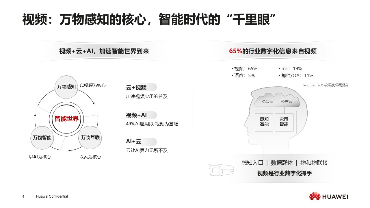 智能世界分为三层:感知、互联、万物智能。从感知层来看,主要是数据采集。我们从一些分析机构分析的数据获取到,在行业数字化转型中,65%的数据是视频数据,足以看到视频在整个行业数字化转型中是非常重要的组成部分。另一个数据是,在我们智能世界里,49%的应用以视频为基础,能够看出视频是万物感知的核心,是智能时代的“千里眼”。