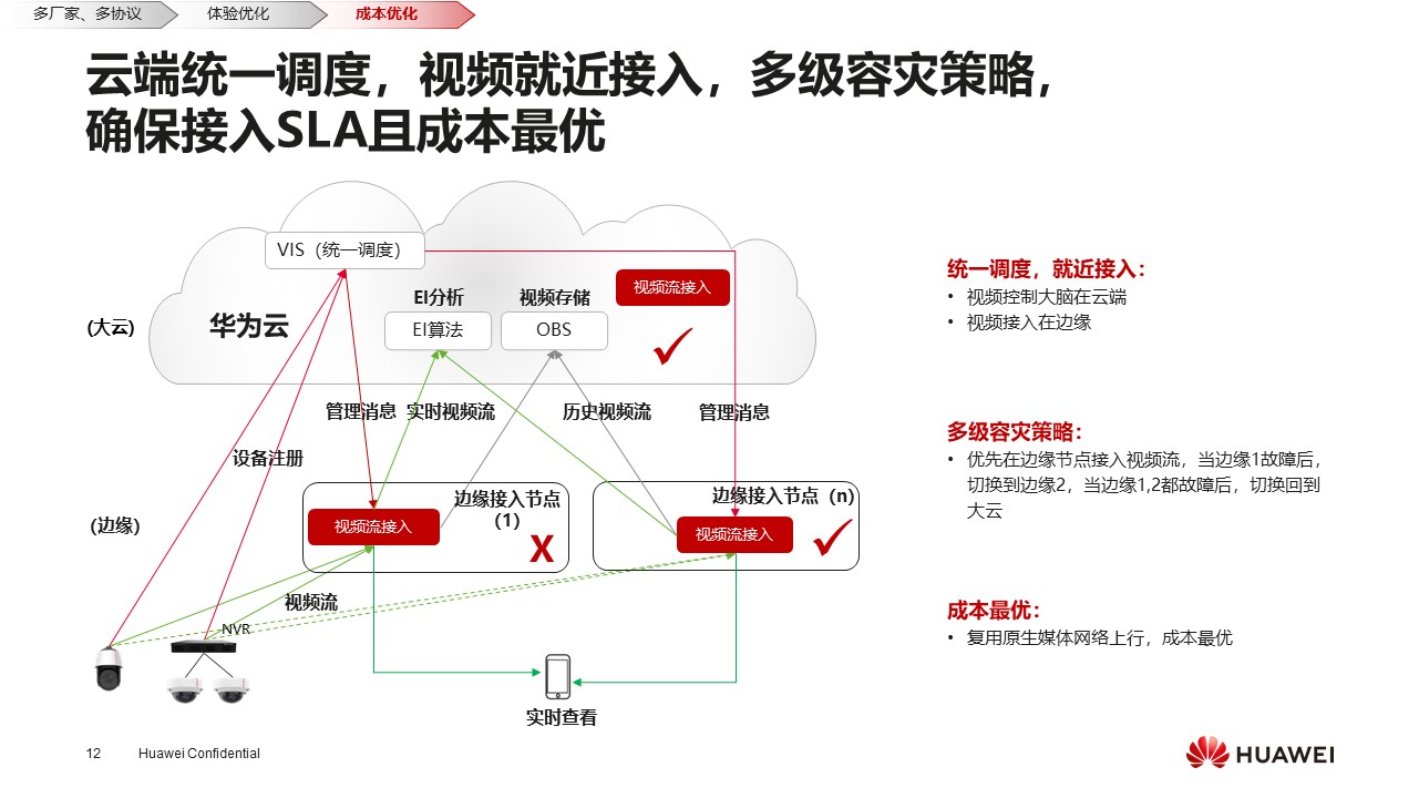 从云端视频接入角度分为几个部分,基于云端统一调度,信令消息优先到大云处理,这就是信令调度过程,如果接入合法,摄像头或NVR会从云端获取接入点。这个接入点可能是不同边缘的地址,基于就近策略或是可靠信令策略进行调度。这样的话会把本来直接调度到大云使用BGP接入的摄像头优先走边缘,边缘再通过专线,把视频回传到大云做相应的EI分析或是存储,这是整体的架构。从可靠性角度来看,假如边缘接入的点故障,视频就会被调度到正在提供可靠业务的其它便于节点。如果真的出现极端情况,边缘节点都出现故障,那我们就会把视频直接调度到大云。所以这里面从整个架构来看,即可以保障接入可靠性,也可以保障成本最低。