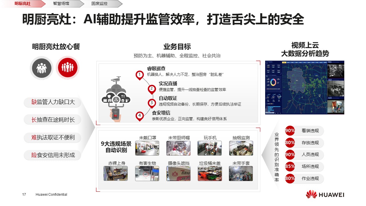 明厨亮灶和大家的生活息息相关。现在家长非常关注学生在学校里的用餐情况,这块是很大的诉求,其次是外卖越来越普及,大家希望看到食物加工过程,如果这些都安排人力监管会形成很大的人力成本,无法达到如此大的规模,所以视频存到云端通过AI分析和大数据分析,可以实现自动识别异常违规场景并呈现给相关监督管理部门。