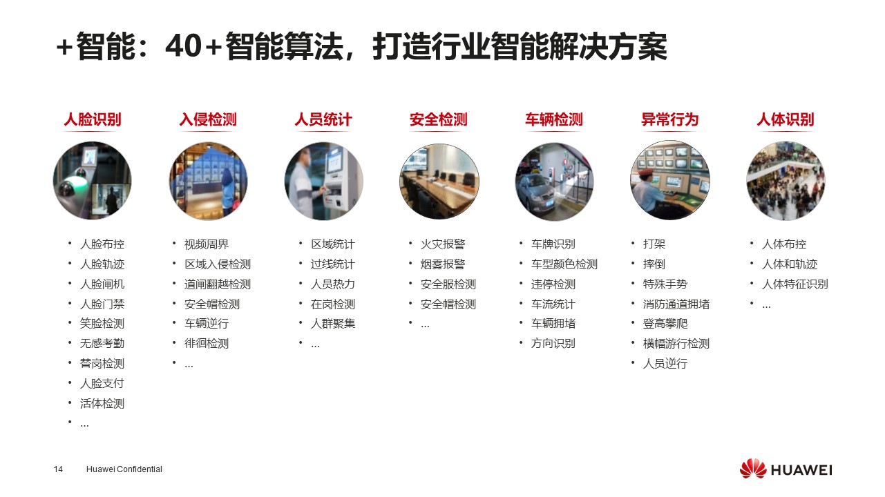 这里我列举了部分与日常生活相关的智能算法,分为七大类:人脸识别,办公楼的闸机会运用此服务;入侵检测,小区运用比较多,如果发现入侵可以识别并告警;人员统计,人员有无聚集,城管场景可以运用到;安全检测,应用到火警、烟雾报警;车辆检测,检测违停、车流统计等;人体识别,人体布控、异常行为等通常应用在城市管理。
