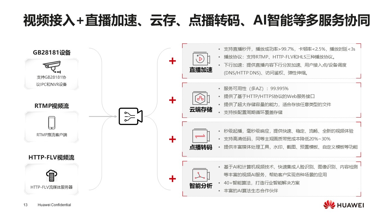 刚才对我们在项目交付过程中遇到的三个问题作了分析。那么视频接入到云后还可以做些什么呢?在华为云上,尤其是和视频相结合的服务包括直播加速,如果视频接入后希望同时让很多人观看,可以和直播加速服务结合,华为直播播放效果达到成功率>99.7%,卡顿率<2.5%,播放时延<3s。在云端华为云的存储能力对外承诺的服务可用性达到99.995%,具有很好的的竞争优势。还有一个结合点,视频上到云端后如果想做一些点播转码,或是有高清低码转换,我们也有配套的视频服务。另外是智能分析服务的结合,接下来我会重点展开介绍。