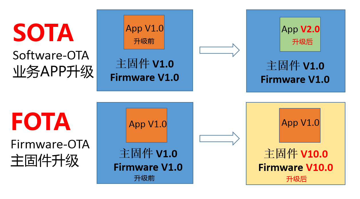 OTA 升级说明 : ( 1 ) 通讯 模组 在线 升级, 统称 为 OTA 。进一步细分 为 SOTA ( Software Over The Air )和 FOTA ( Firmware Over The Air )。 ( 2 ) SOTA 主要 指用户业务 APP 升级 。 当 用户需求变更、 增加 代码 功能 、 紧急修复现场 问题 等 绝大多数场景 下,可以采用 SOTA 远程 升级 。 ( 3 ) FOTA 主要 指通讯模组 主 固件 升级。 在模组 固件 出现 重大 变更时 , 不升级可能 会影响模组正常运行的 场景下 , 可以 谨慎采用 FOTA 远程 升级。