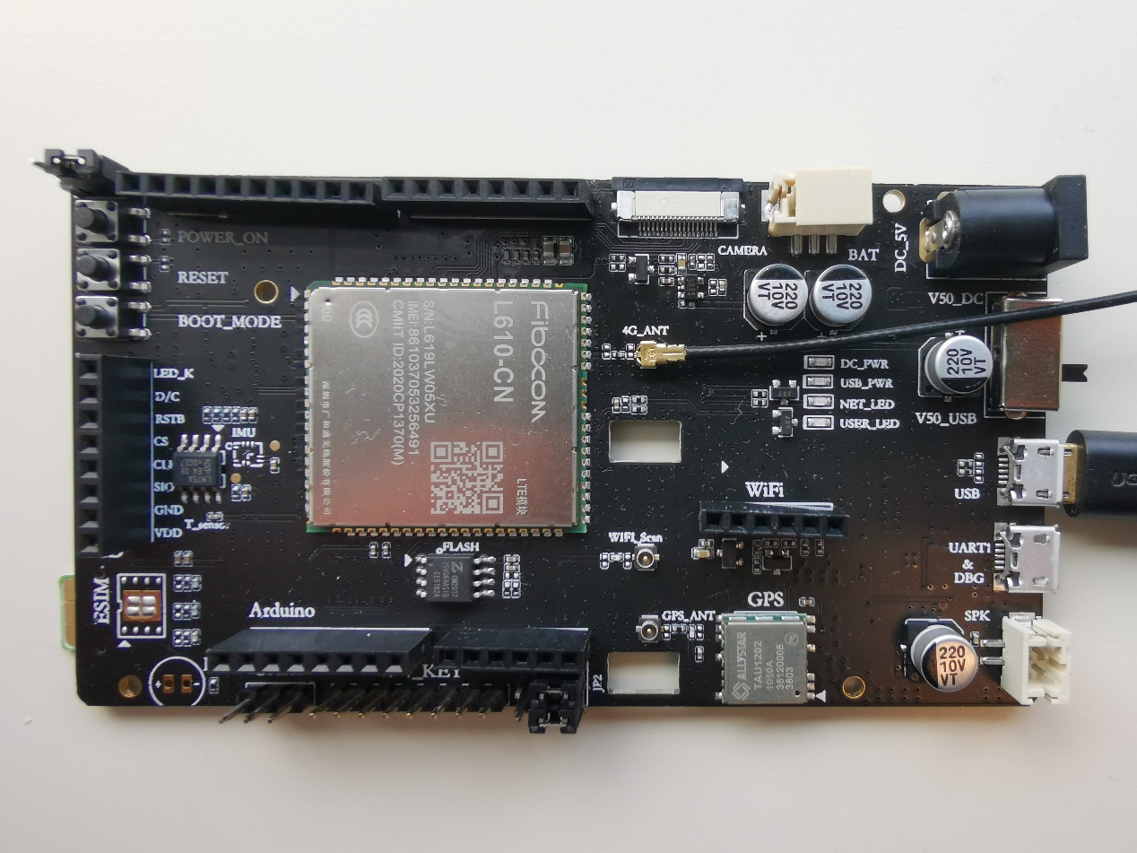( 1 )本文 使用 FIBOCOM L610-AEVK 开发板 。 L610_Arduino_EVK 是基于 fibocom CAT1 产品 L610 openCPU 模组的开发套件,具备 Arduino 接口, 可以支持 Arduino 接口配件板,搭配 GPS 定位、 WiFi 、六轴定位传感器 、 温度传感器 、 8MB Flash 、麦克风、喇叭、 LCD 显示屏、 摄像头 、 2Kb EEPROM 、 4*4 矩阵按键组使用。 这是 一个非常强大的Cat.1 开发板 , 想做Cat.1产品 的开发者 必备 神器 。   ( 2 )如 上图所示,在 4G_ANT 插上开发板 附赠的天线。 U SB 接口连接 电脑。插入 SIM 卡 。 注意 : 建议 USB 直接 连电脑。 我遇到 一个问题 (仅供 参考 ) : 把 USB 接到 USB 分线器 , 此时 coolwatcher 软件 、串口调试助手等软件,运行不正常 。 USB 直连 电脑, 软件 运行正常。