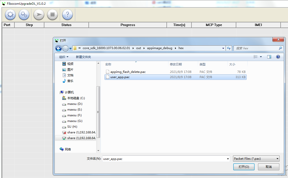 ( 3 ) 打开升级软件 FibocomUpgradeDL_V1.0.2.exe 。 选择 user_app .pac