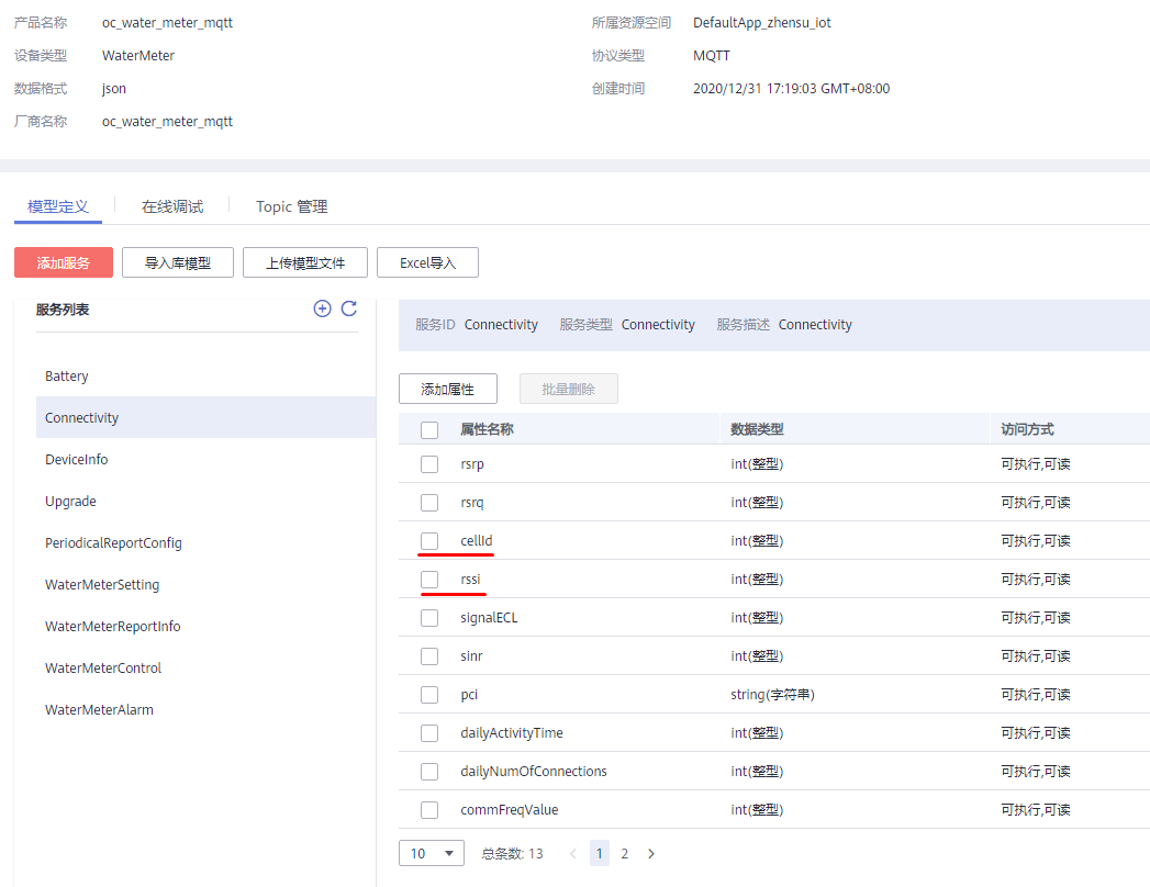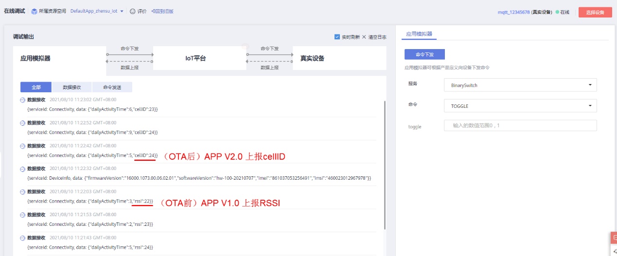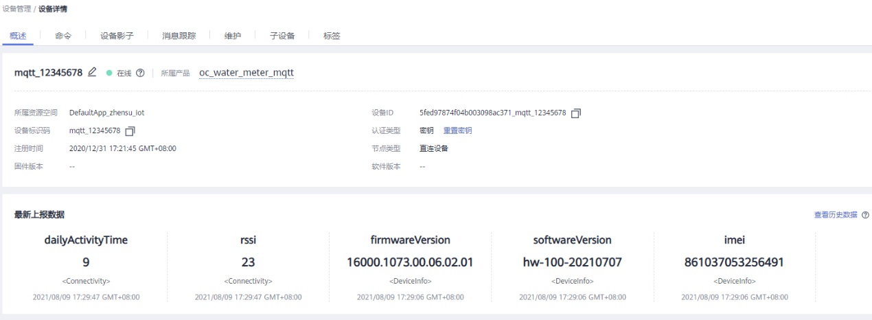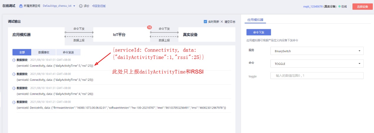 ( 1 )华为云 上 查看设备 详情,可以看到设备已在线。  ( 2 ) 华为云 上打开产品 选项 ,选择在线调试,点击 设备 。 可以 看到设备 已经 在线 , data 正在 上报到华为云 。 {serviceId: Connectivity, data: {"dailyActivityTime":1,"rssi":25}} 此处只上报 dailyActivityTime 和 RSSI 。  |