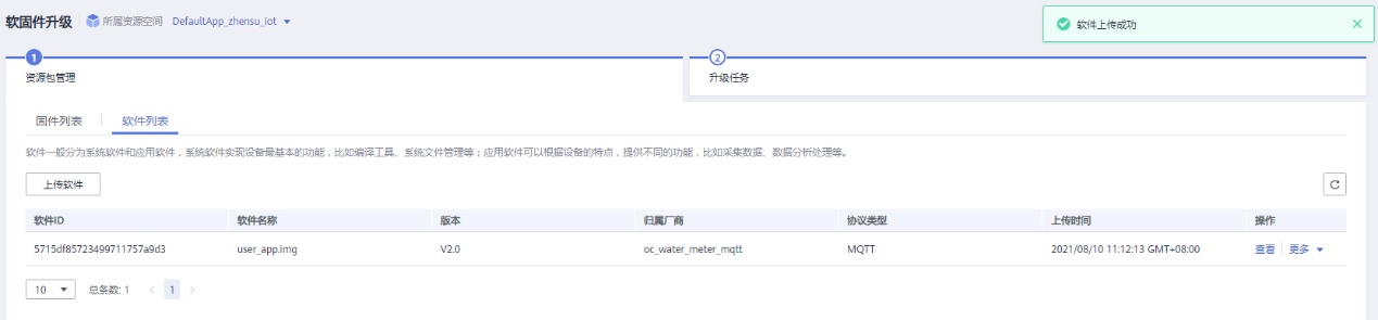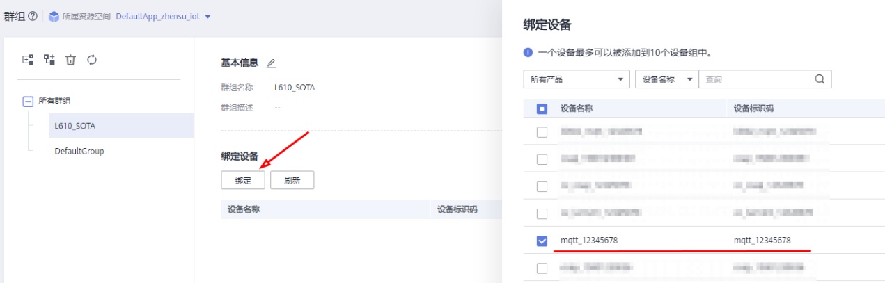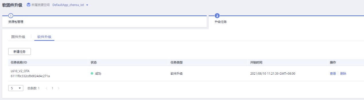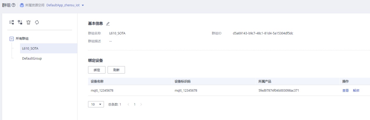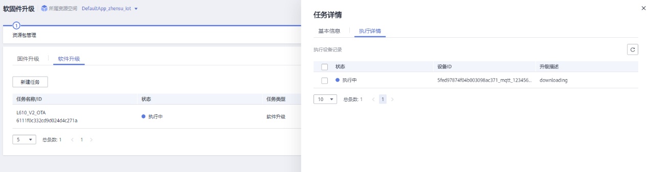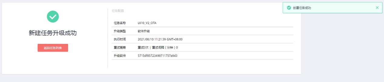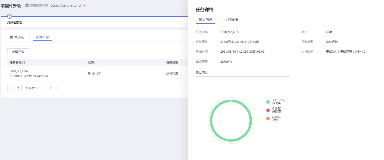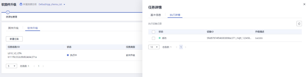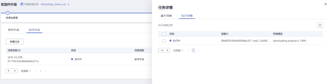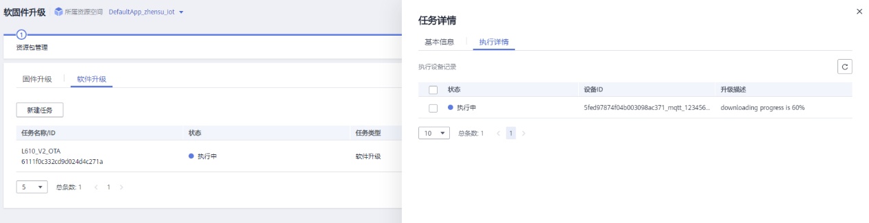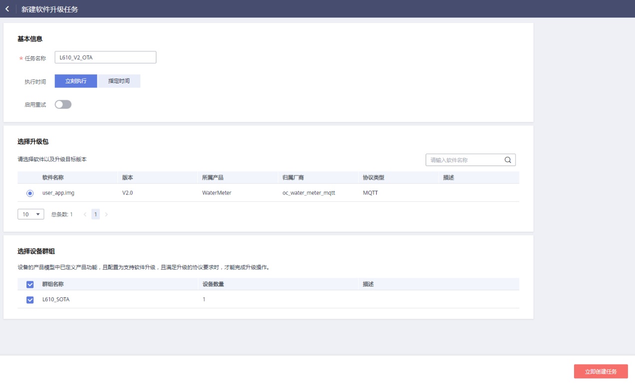 ( 1 )进入 设备 - 群组, 新建 一个群组,取名: L610_SOTA 。  ( 2 ) 选择 L610_SOTA 群组 ,选择绑定,绑定 mqtt_12345678 的真实 设备。   ( 3 )进入 设备 - 软固件升级 。先 选择软件列表,点击上传软件。  ( 4 )选择 已经 生成 的 APPV2.0 固件 : user_app.img 文件 。 软件 版本填写 V2.0 。  ( 5 ) 确认后 , 软件 上传成功。  ( 6 ) 点 升级任务 界面 , 新建 任务。  ( 7 ) 输入 任务名: L610_V2_OTA ( 不强制要求 任务 名字 , 能清楚分辨 管理 每个 任务 即可 ) 。 选择 APPV2.0 固件 ,选择待升级群组。 立即创建任务。   ( 8 ) 查看 软件 升级任务 , 目前 状态 正在执行中。  ( 9 )查看 执行详情, 可以 看到 downloading 、 do wnloading progress is 60% 、 su ccess 等 升级 进度信息。    ( 10 ) 升级 任务最后显示 成功。    ( 11 )查看 在线调试界面 。未 升级前,模组上报 RSSI 。 O TA 在线 升级后,模组 自动 上报 cellID 。 O TA 成功 了 。