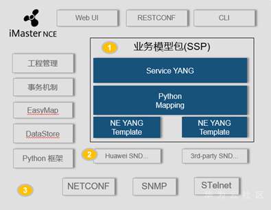那么反过来,设备上的信息,也可以先由SND包中的设备YANG识别,再经过Python映射,传递到业务YANG,从而将设备上的业务数据同步到控制器,进而生成UI界面与北向API接口数据。