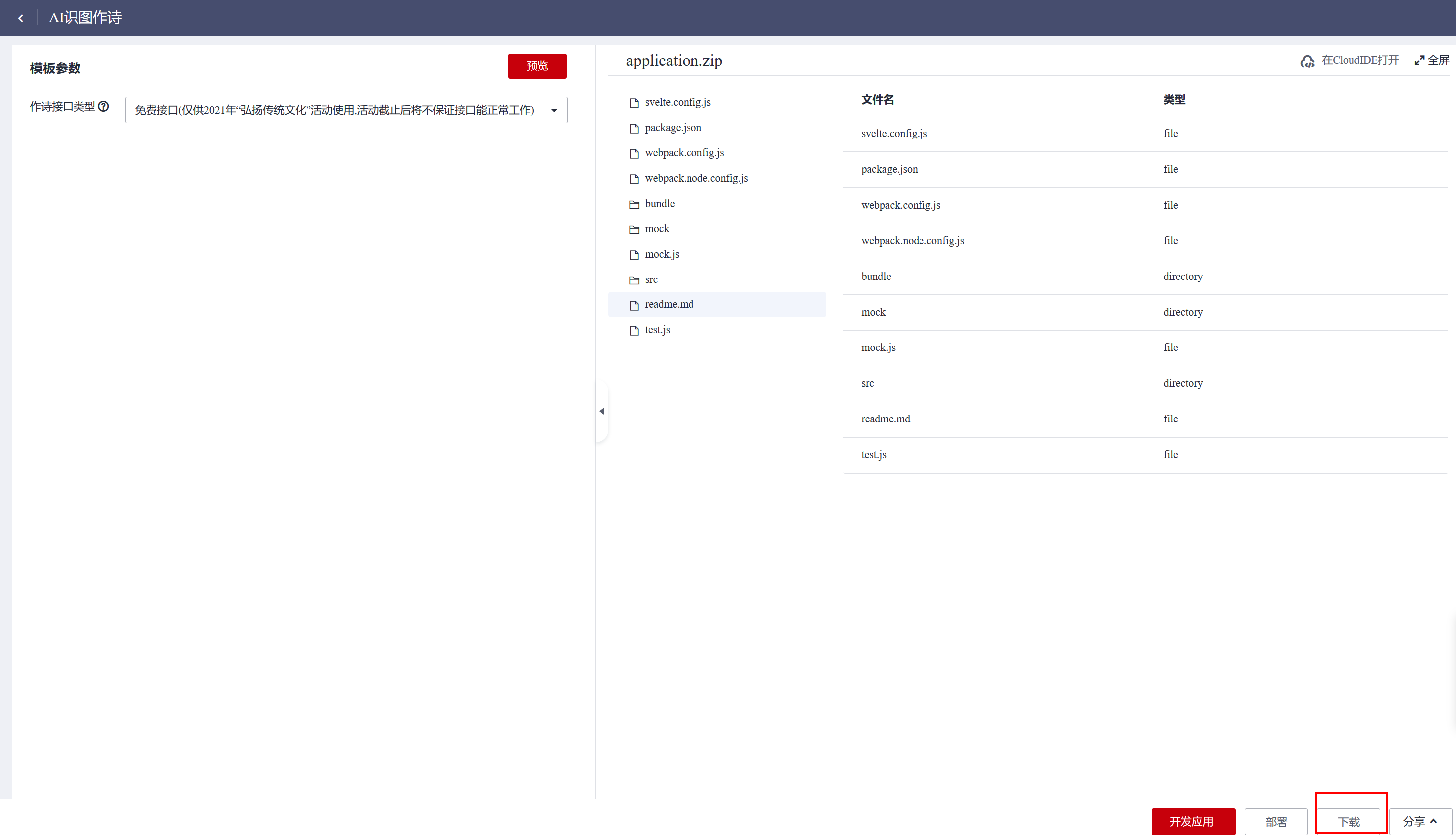 点击 “ AI 识图 作诗 ”模板卡片后,里面详细描述了如何将模板代码部署至华为云函数工作流 FunctionGraph 上 :
