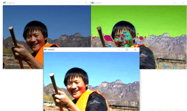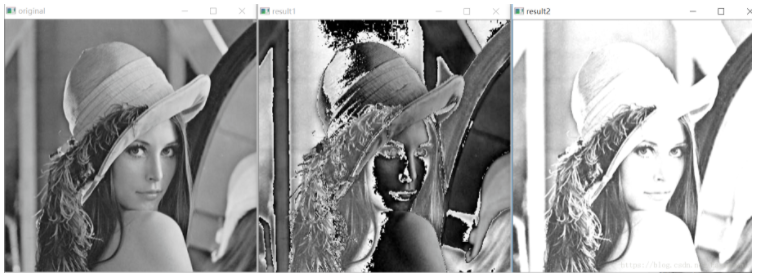 输出结果如下图所示,其中result1为第一种方法,result2为第二种方法,白色点255更多。
