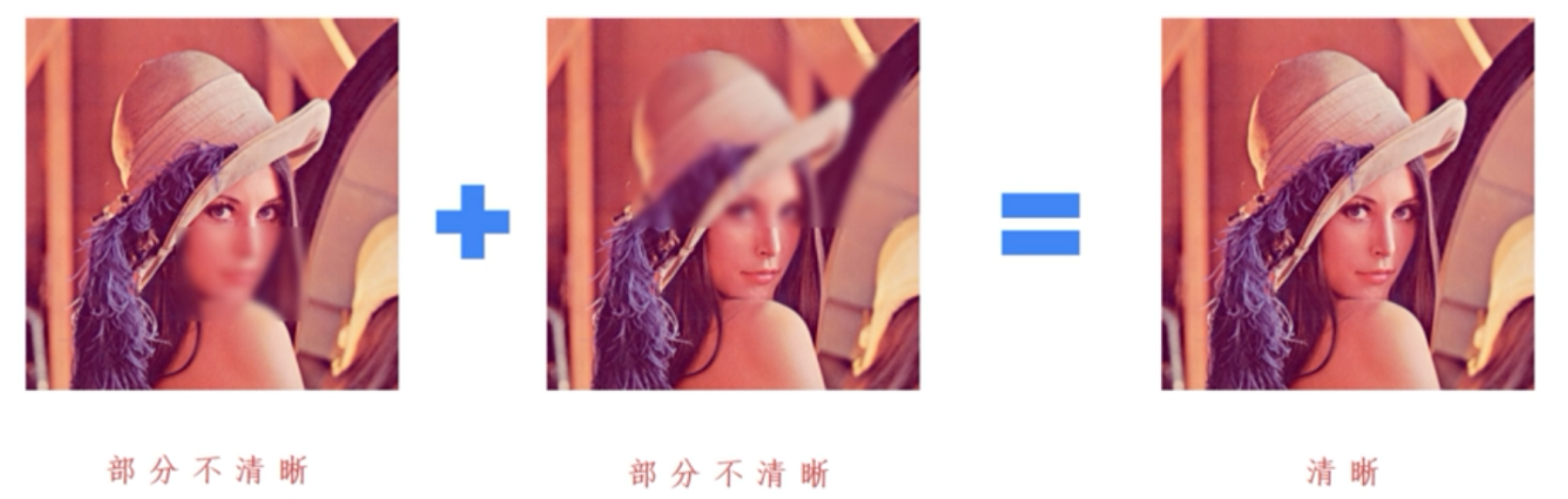 图像融合通常是指将2张或2张以上的图像信息融合到1张图像上,融合的图像含有更多的信息,能够更方便人们观察或计算机处理。如下图所示,将两张不清晰的图像融合得到更清晰的图。
