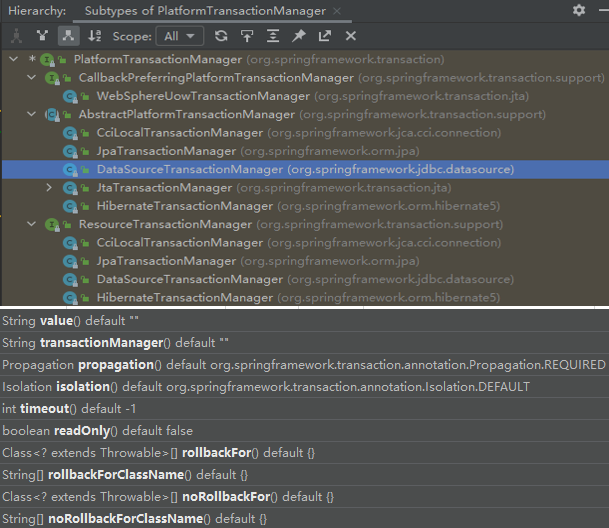 @Transactional (readOnly = false,timeout = -1,propagation = Propagation.REQUIRED, isolation = Isolation.READ_COMMITTED)