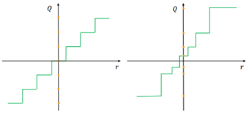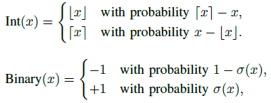 在推理过程中,量化方案通常是确定性的。然而,这并不是唯一的可能性,一些工作已经探索了随机量化用于量化感知训练以及降低精度训练。高层次的直觉是,与确定性量化相比,随机量化可能允许NN进行更多探索。人们通常认为小的权重更新可能不会导致任何权重变化,因为四舍五入操作可能总是返回相同的权重。然而,启用随机舍入可能会为NN提供转变的机会,从而更新其参数。下面公式为在Int量化和二值量化的随机舍入方式。