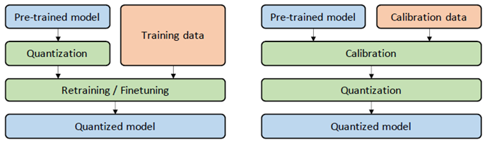 量化后,通常需要调整神经网络(NN)中的参数。这可以通过retraining模型来执行,该过程称为量化感知训练(QAT),也可以在不retraining的情况下完成,该过程通常称为训练后量化(PTQ)。上图显示了这两种方法之间的示意性比较(左图为量化感知训练,右图为训练后量化),并在下文进一步讨论。