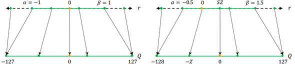 在理想的情况下,如上图左图所示,特征分布比较均匀,因此可以对模型进行对称量化,即以0点值左右两边绝对值相等进行量化。但是很多情况下模型权重或特征是分布不均匀的,不一定在0点值两边对称,如上图右图所示,直接进行对称量化会某一侧的特征被严重压缩,大量丢失网络信息,因此可为了尽可能以的保持原网络表示的信息,可进行非对称量化。
