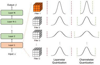 c)通道量化:裁切范围的一个通常选择是为每个卷积滤波器使用固定值,独立于其他通道,如上图最后一列所示。也就是说,每个通道都被分配了一个专用的缩放因子。这确保了更好的量化分辨率,并通常导致更高的精度,通道量化是目前用于量化卷积核的标准方法。