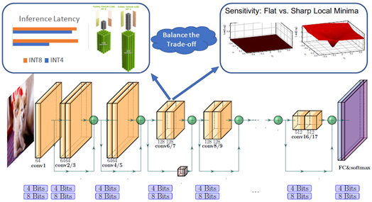 很容易看到,随着我们使用较低精度量化,硬件性能得到了提高。然而,将模型均匀量化到超低精度可能会导致精度显著下降。可以通过混合精度量化来解决这个问题。在这种方法中,每个层都以不同的位精度量化,如上所示。这种方法的一个挑战是,选择此位设置的搜索空间在层数上是指数级的。