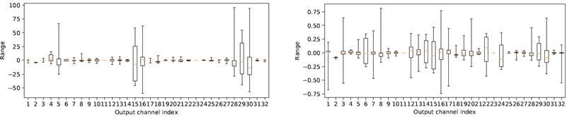 如下图(左)所示,同一层的卷积核值范围分布极不均衡,而每通道量化又实现相对复杂和消耗额外的时间,因此提出对权重进行均衡化,如下图(右)所示,经过均衡化后,整体值范围分布相对均衡。