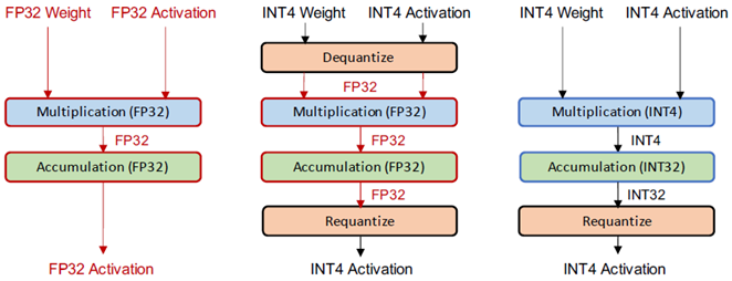 部署量化NN模型有两种常见的方法,模拟量化(又名伪量化)和仅整数量化(又名定点量化)。在模拟量化中,量化的模型参数存储在低精度中,但操作(如矩阵乘法和卷积)是用浮点算法执行的。因此,量化参数需要在浮点运算之前反量化,如图上图(中间)所示。因此,人们不能完全受益于快速高效的低精度逻辑与模拟量化。然而,在纯整数量化中,所有操作都使用低精度整数算术执行,如上图(右)所示。这允许整个推理可以用有效的整数算法执行,而不需要对任何参数或激活进行任何浮点反量化。