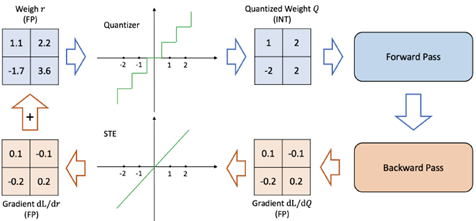 给定一个训练好的模型,量化可能会对训练好的模型参数引入扰动,这可能会将模型偏离以浮点精度训练时收敛到的点。可以通过使用量化参数重新训练NN模型来解决这个问题,以便模型能够收敛到具有更好损失的点。一种流行的方法是使用量化感知训练(QAT),其中通常的正向和反向传递是在浮点中对量化模型执行的,但模型参数在每次梯度更新后都会量化。特别是,在以浮点精度执行权重更新后,执行此投影非常重要。使用浮点执行向后传递非常重要,因为在量化精度中累积梯度可能会导致零梯度或具有高误差的梯度,特别是在低精度中。