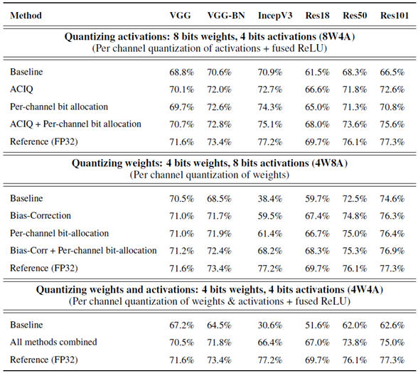 该文章使用4bit精度实现了训练后量化,提出了分析计算最佳剪辑范围(ACIQ)和通道位宽设置。ACIQ提出以最小量化误差为优化目标,通过优化的方式得到不同精度量化的最优裁断值,同时还提出了在总bit精度固定的情况下,不同通道设置不同的精度进行量化,可以实现更加合适和准确的量化,但是不同通道设置不同的bit进行量化难以实现工业加速。下表展示了得到的实验结果,在4bit量化下,模型下降2%左右的准确率。