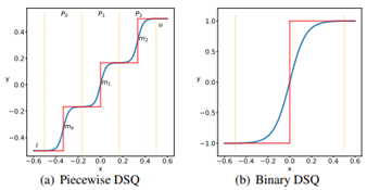DSQ采用一系列双曲正切函数逐步逼近阶梯函数进行低比特量化(如1比特情况下的符号函数),同时保持平滑性,便于梯度计算。该文章针对一个近似特征变量重新构造了DSQ函数,并相应地发展了一种进化训练策略来逐步学习微分量化函数。在训练过程中,DSQ和标准量化之间的近似值可以由特征变量控制,特征变量和限幅值可以在网络中自动确定。DSQ减少了由极低比特量化引起的偏差,从而使训练中的前向和后向过程更加一致和稳定。