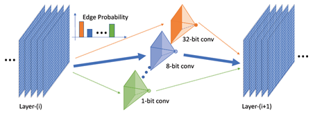 为了实现混合精度的量化,该论文在DNAS的基础上,将不同bit量化作为不同的结构(如下图所示),搜索优化得到不同层不同的量化精度。