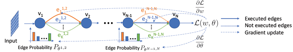 如上图所示,该论文提出了可微分NAS(DNAS),该NAS方法将候选操作以概率θ随机激活,而非直接的softmax进行加权,并且概率θ作为搜索过程中可以优化的参数。由于DNAS前期初始化以相等的概率进行随机激活操作,而在训练后期概率θ会出现明显的差异化,因此DNAS在前期训练时似DARTS,而后期似ENAS。