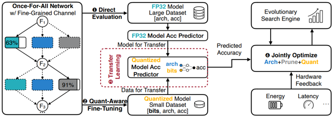 该论文提出了APQ,用于在资源受限硬件上高效的深度学习推理。与以前分别搜索神经架构、剪枝策略和量化策略的方法不同,该论文以联合的方式优化它们。为了应对它带来的更大的设计空间,提出训练一个量化感知的精度预测器,以快速获得量化模型的精度,并将其反馈给搜索引擎,以选择最佳拟合。