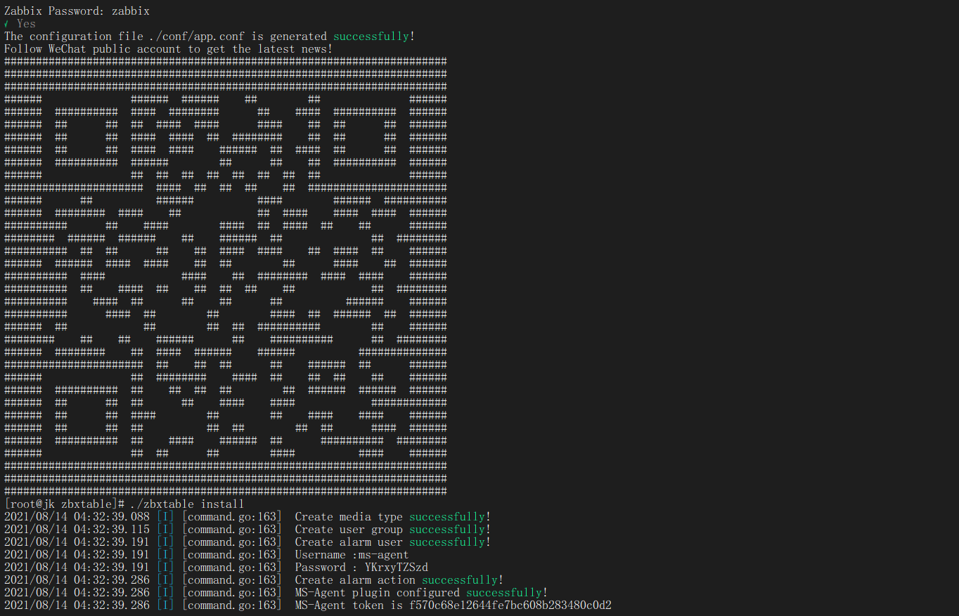 #app.ini与app.conf的Token要保持一致,否则无法正常收到告警,ZbxTable会自动在zabbix上建立一个ms-agent用户,密码为随机,权限为管理员。