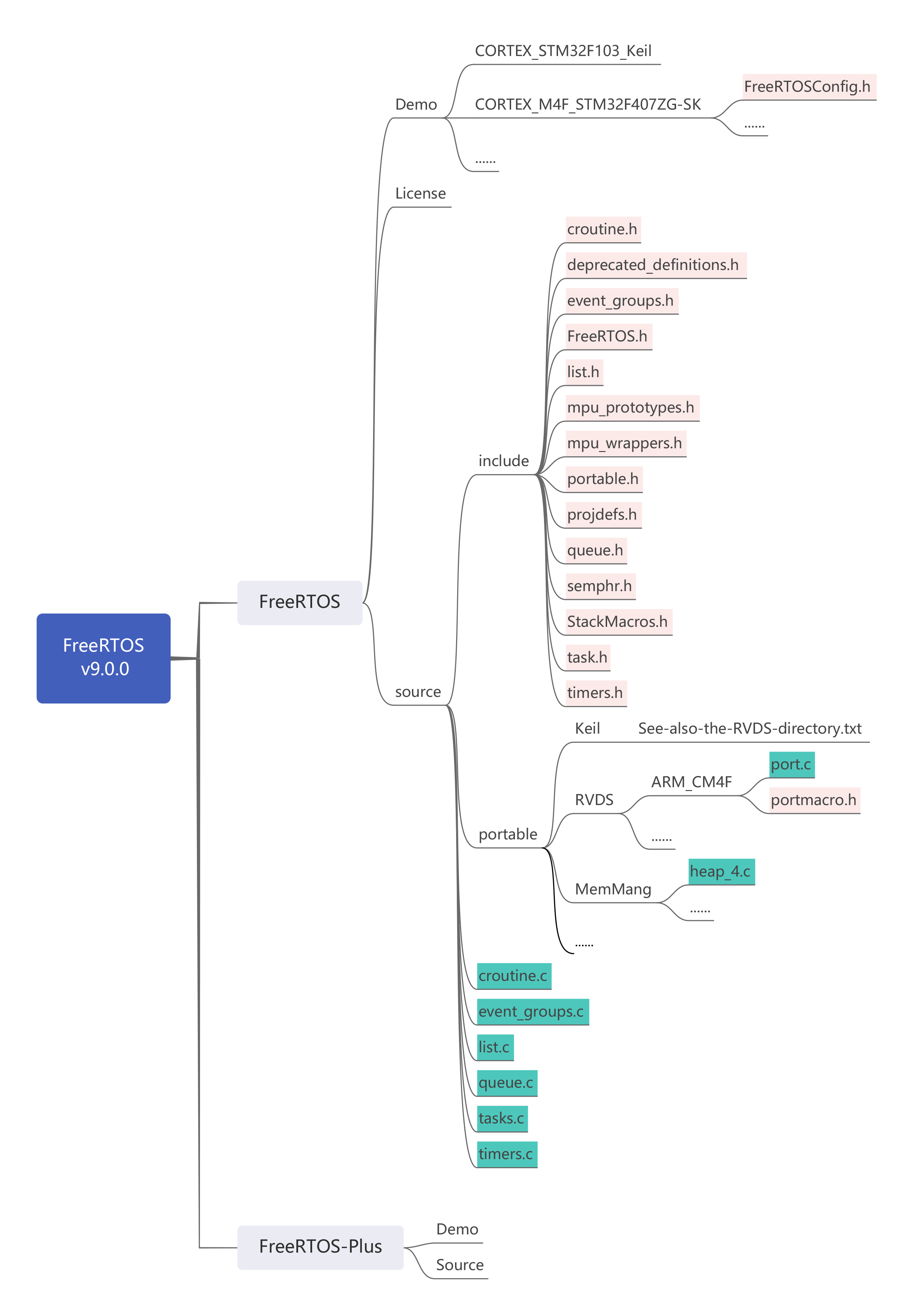 这里以FreeRTOS v9.0.0版本为例,代码包含FreeRTOS和FreeRTOS-Plus文件夹,后者是一些补充文件,初学者用不到,可以先忽略。在FreeRTOS文件夹中主要关注source文件夹,这里是FreeRTOS的全部源码,包括6个c文件和include文件夹下的多个h文件。另外,在portable文件夹下,是针对不同硬件平台的单独区分使用的代码,目前考虑使用Keil开发STM32F407,所以portable文件夹只需使用RVDS的ARM_CM4F以及MemMang。