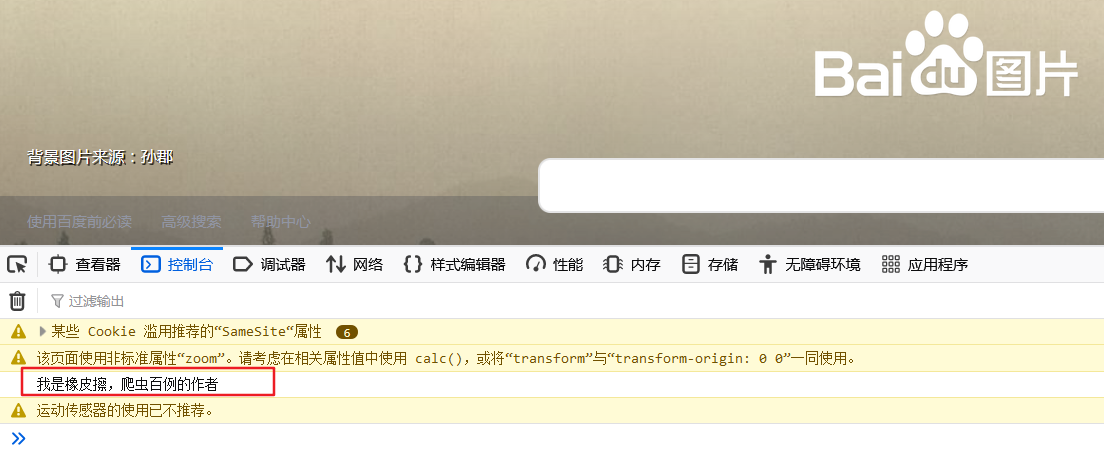 依旧是以百度图片为例,打开百度图片网站之后,通过 Selenium 在开发者工具的 Console 选项卡中输入一段内容。