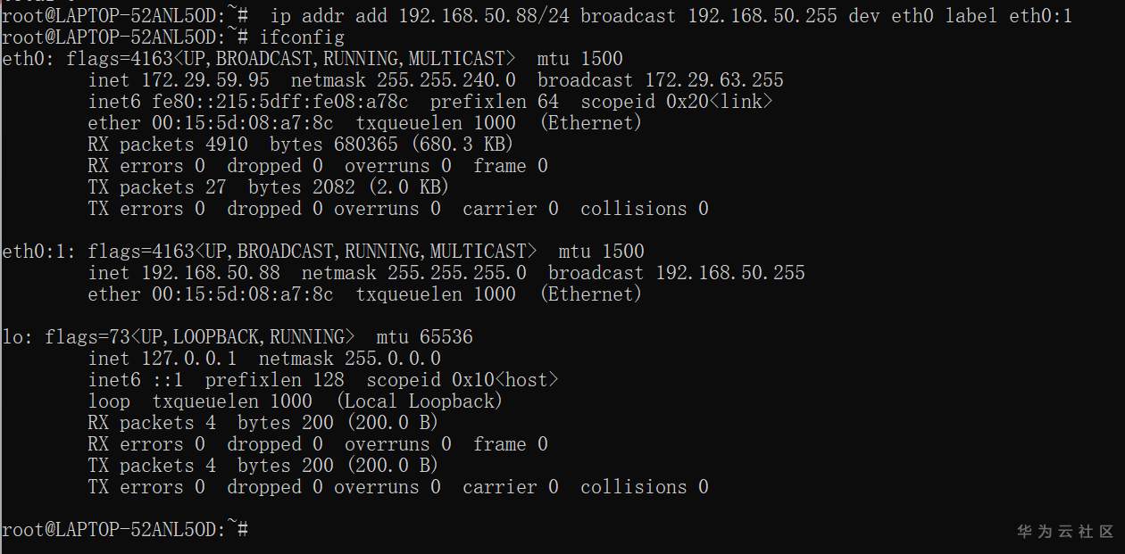 ip addr add 192.168.50.88/24 broadcast 192.168.50.255 dev eth0 label eth0:1