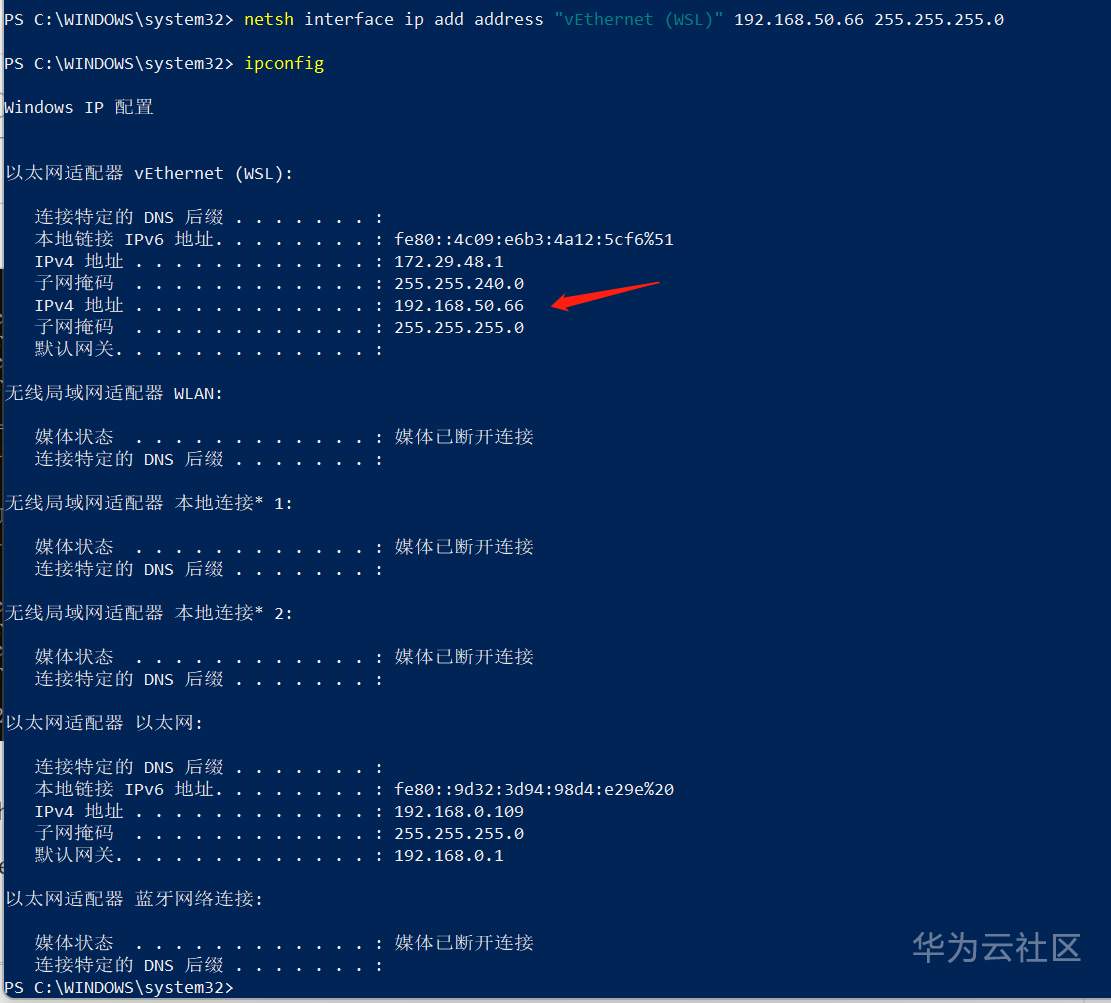 netsh interface ip add address "vEthernet (WSL)" 192.168.50.66 255.255.255.0