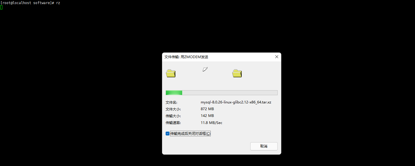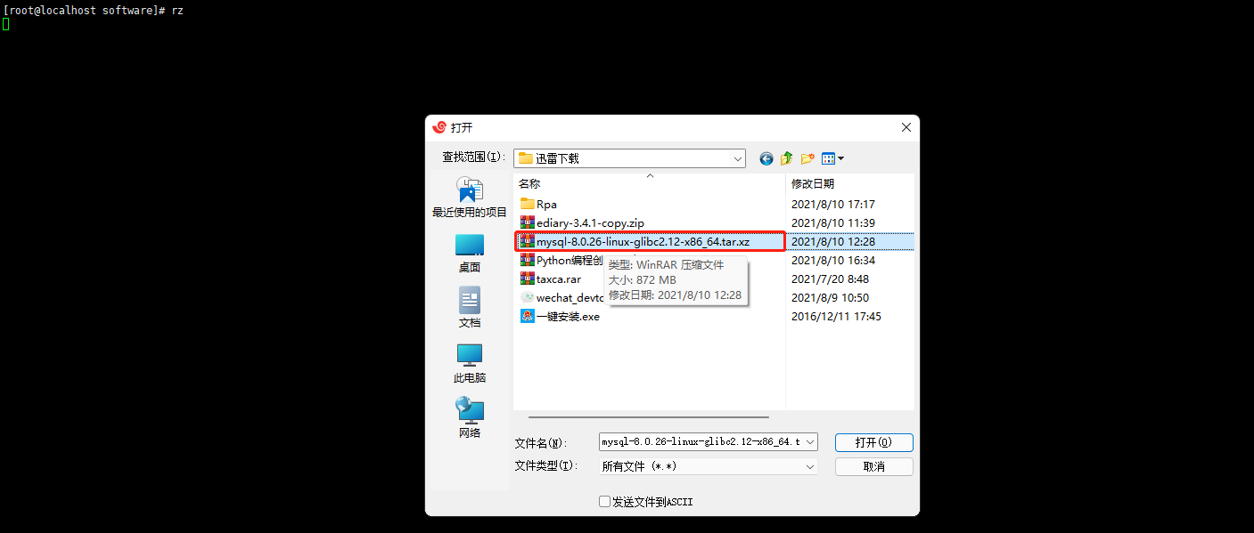输入rz命令回车,弹出文件选择框,选择mysql安装包,点击打开,即开始上传文件。