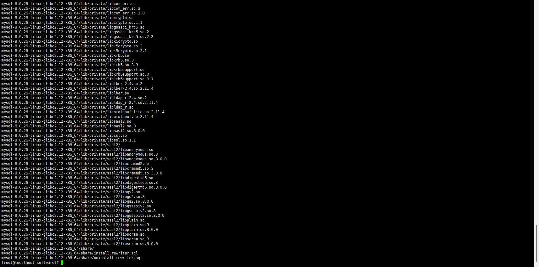 [root@localhost software]# tar -xvf mysql-8.0.26-linux-glibc2.12-x86_64.tar.xz -C /opt/module/