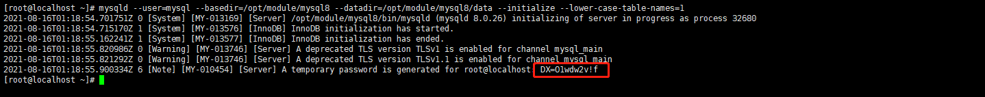 [root@localhost ~]# mysqld --user=mysql --basedir=/opt/module/mysql8 --datadir=/opt/module/mysql8/data --initialize --lower-case-table-names=1